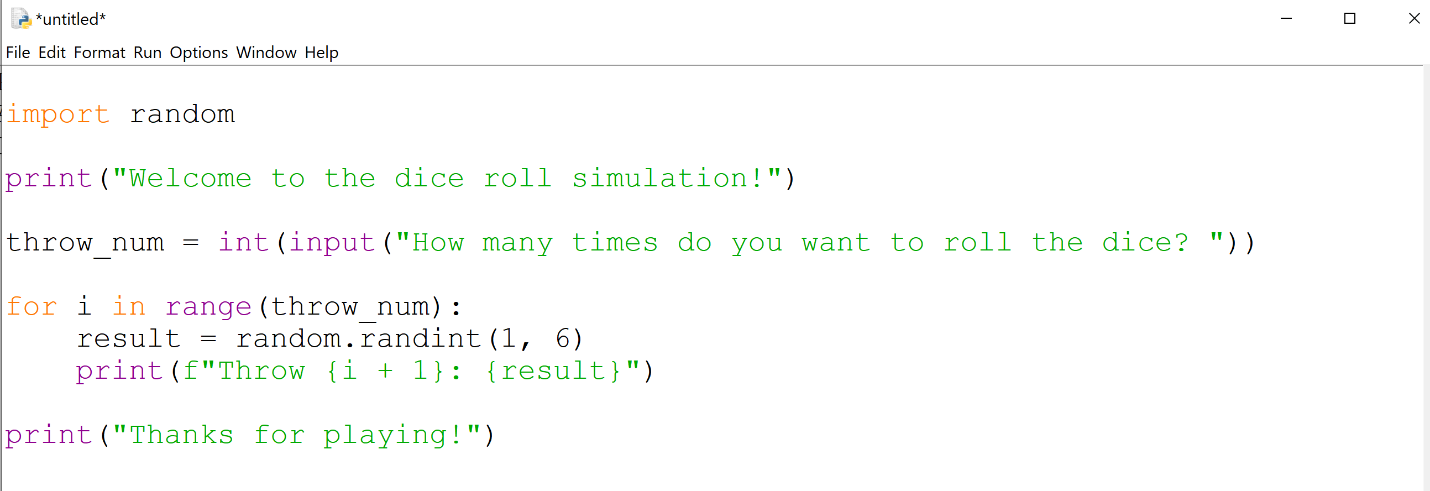 - Enter the number of throws: The programme asks the user to enter the number of times he wants to roll the dice. We convert the entered number to an integer using int().